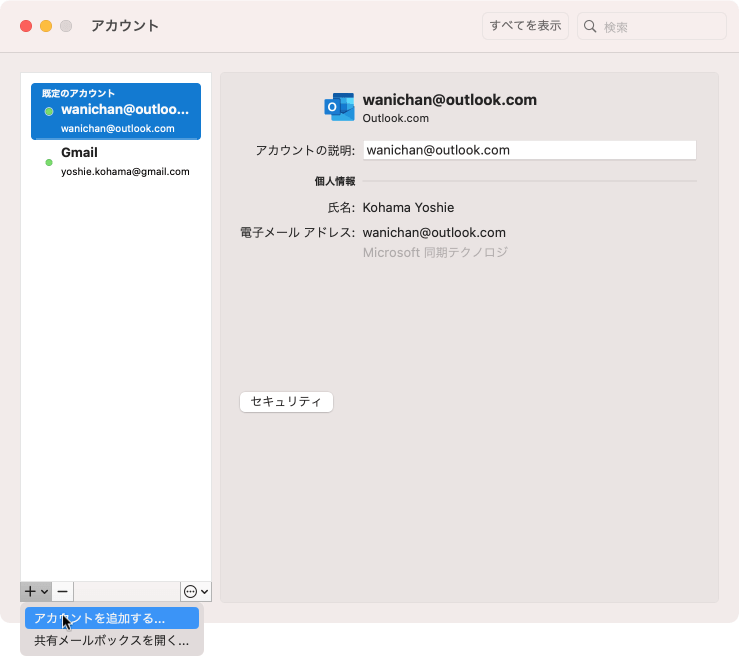 - [アカウント]ウィンドウで、左下の[+]をクリックして[アカウントを追加する]をクリックします。