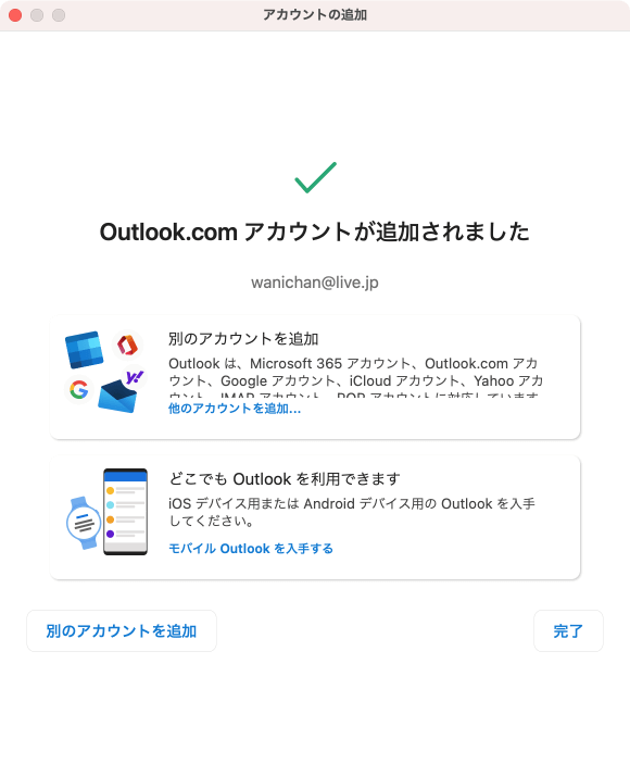 - Outlook.com アカウントが追加されたら[完了]ボタンをクリックします。