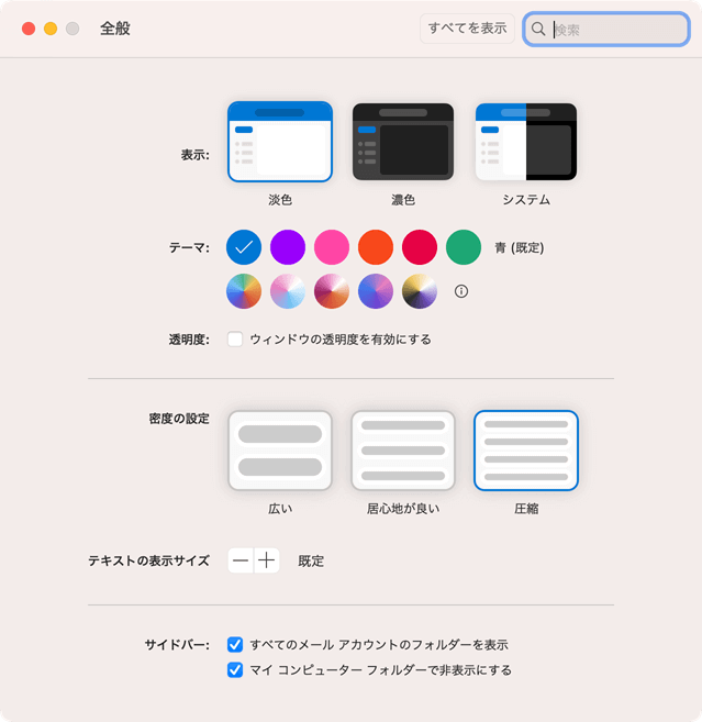 新しいOutlook for Macにおける、既定の表示密度は「広い」が設定されています。[ビュー]メニューの[表示密度]一覧から、もしくはOutlookの設定の[全般]の[密度の設定]にて[圧縮][居心地が良い][広い]のいずれかを選択します。