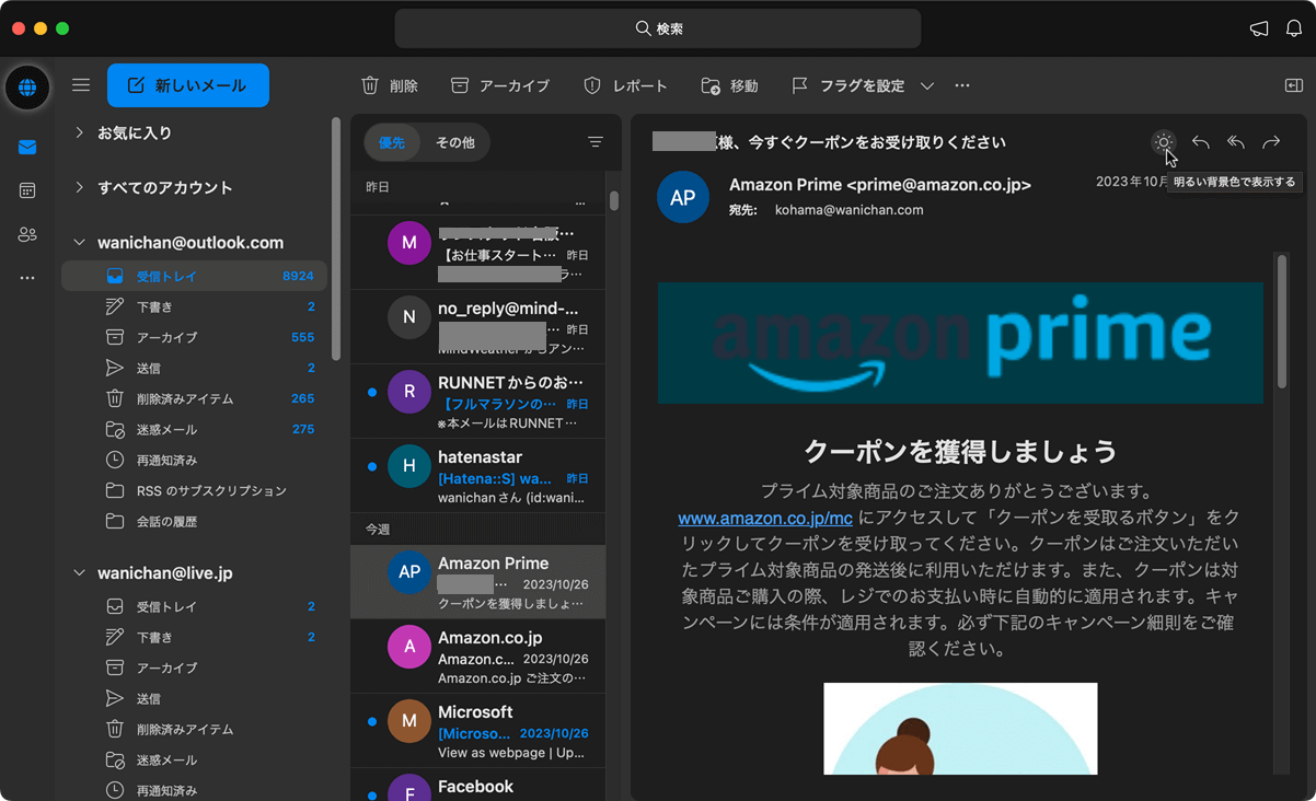 メッセージウィンドウの右上の太陽アイコンの[明るい背景色で表示する]をクリックすると、太陽から三日月のアイコンに切り替わります、従来のOutlookの場合は[ホーム]タブの[背景色の切り替え]を押してもOKです。