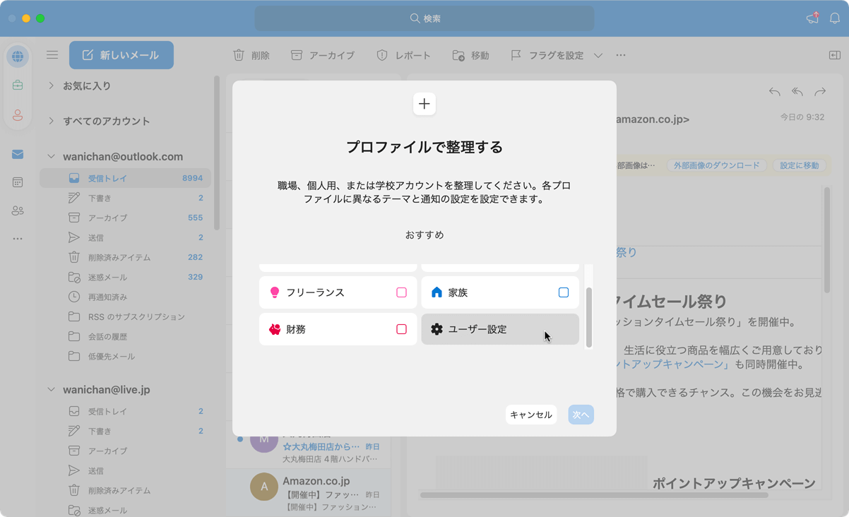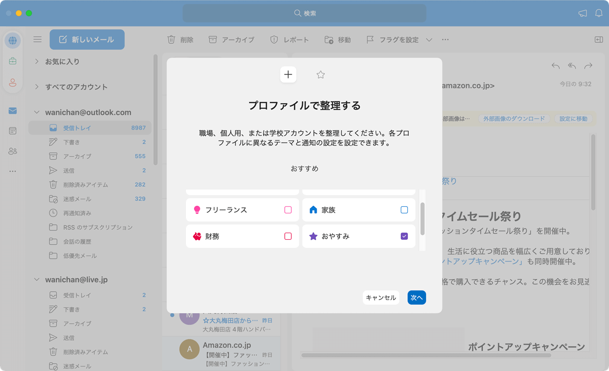 - 適用するメールアカウントを選択して[完了]ボタンをクリックします。