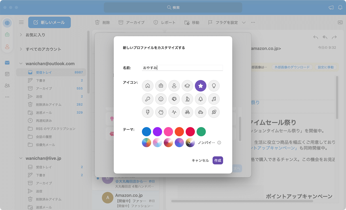 - プロファイルの名前とアイコン、テーマを選択して[作成]ボタンをクリックします。