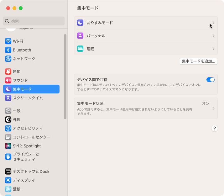 - Dockから、もしくはAppleアイコンからシステム設定を開き、[集中モード]を開きます。