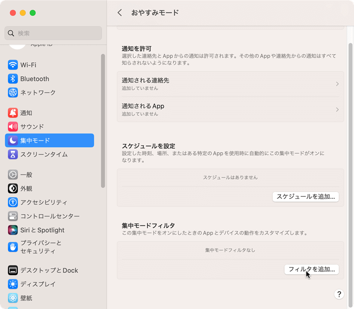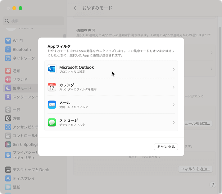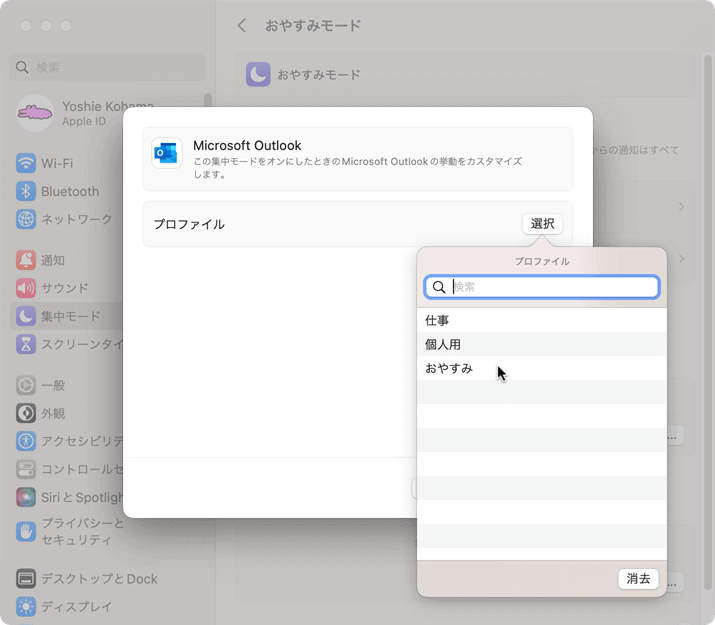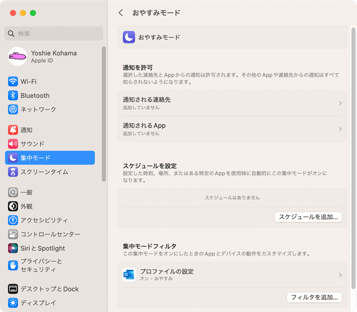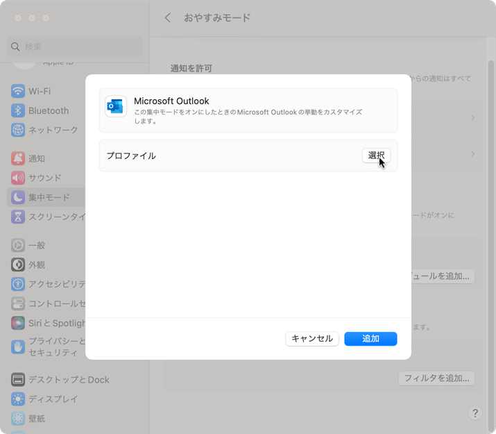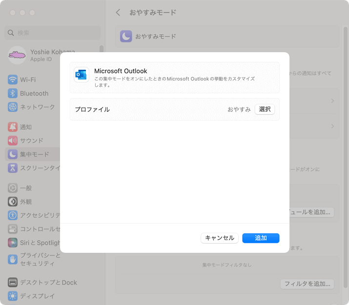 ユーザー設定のプロファイルを作成したあと、Macのシステム設定の[集中モード]から目的の集中モードを選択し、集中モードフィルタにOutlookのプロファイルと紐づける方法について説明します。