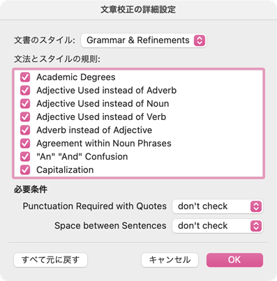 既定では、エディターは複数のカテゴリの問題をチェックし、修正候補は文章のスタイルに適合していることもあれば、そうでない場合もあります。 エディターで必要な修正候補を微調整するには、[文章校正の詳細設定]ダイアログボックスでエディターのチェック対象にする問題を選択し、エディターで無視する問題をクリアします。