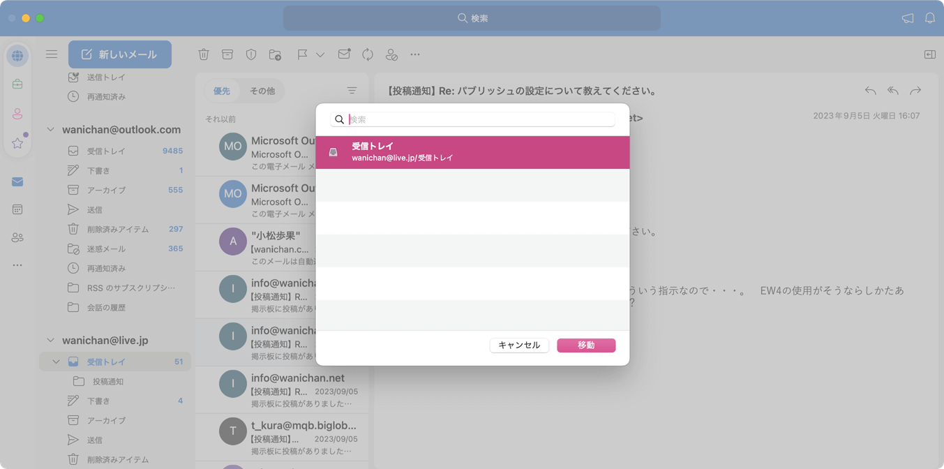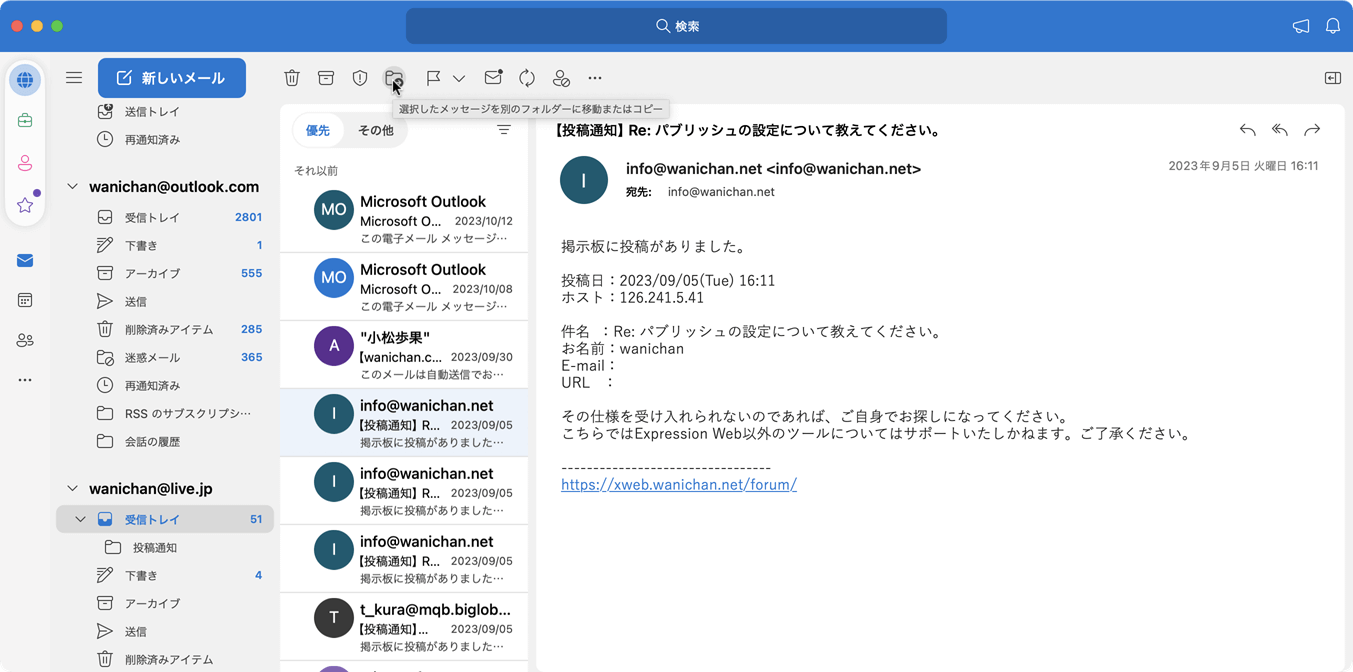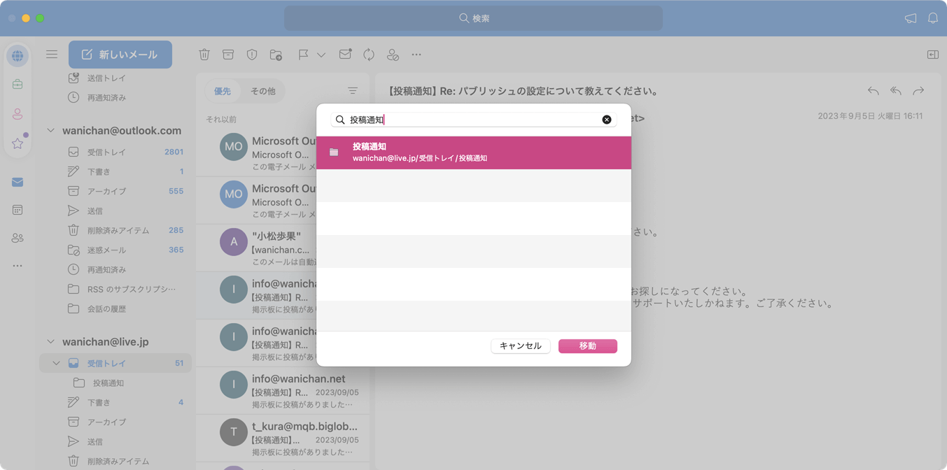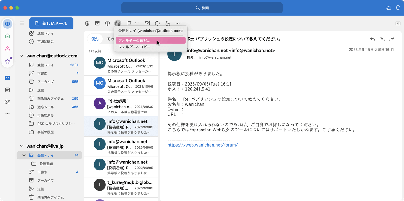 選択したメッセージを別のフォルダーに移動するには、ツールバーの[移動]一覧から[フォルダーの選択]を選択するか、[メッセージ]メニューの[移動]一覧から[フォルダーの選択]を選択して、移動先フォルダーを検索して選択します。移動するフォルダーを選択するショートカットキーはshift+command+Mです。