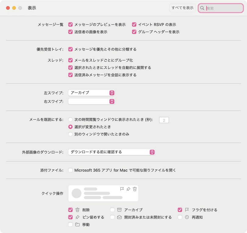 メール一覧から対象のメッセージに触れた時に表示される既定のクイック操作は[削除][フラグを付ける][ピン留めする]の3種類です。その他に[アーカイブ][開封済みまたは未開封にする][再通知][移動]も表示できます。