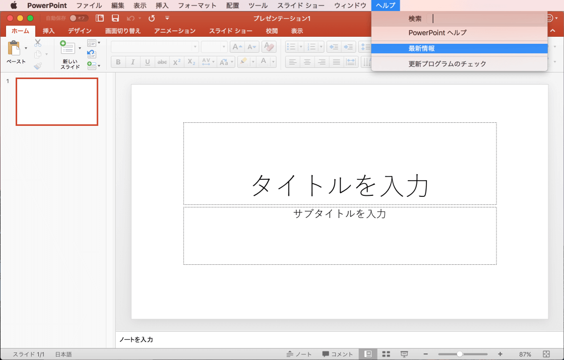 Office 2016をMacにインストール後に更新プログラムが適用されて新機能が追加された場合は、最新情報として表示されます。追加された新機能について確認するには、[ヘルプ]メニューの[最新情報]をクリックします。
