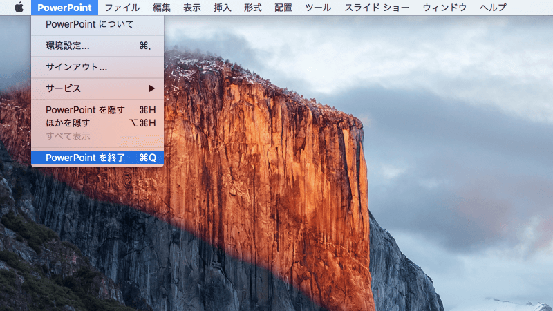 - [PowerPoint]メニューの[PowerPointを終了]を選択するか、Commandキーを押しながらQキーを押します。