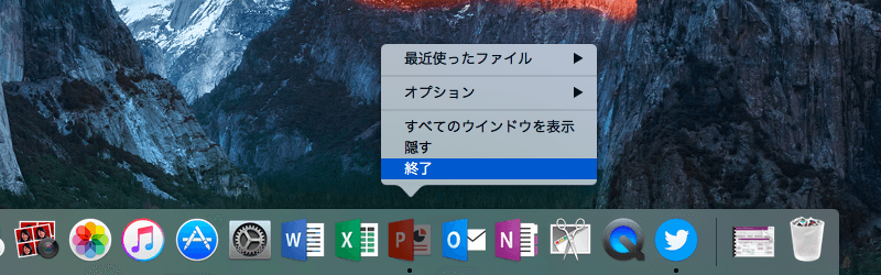 DockからPowerPointアプリを右クリックしてショートカットメニューより[終了]することも可能です。