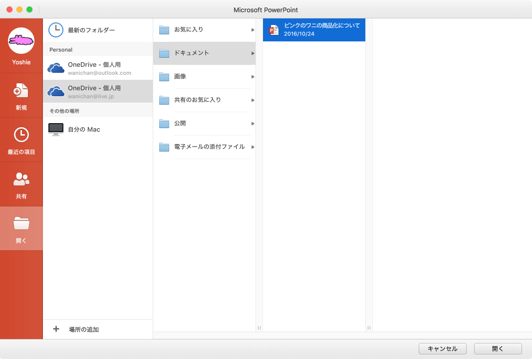 Office 2016 for MacからOneDrive上のファイルを扱えるようになりました。ここでは、OneDrive上のPowerPointプレゼンテーションを開く方法について説明します。