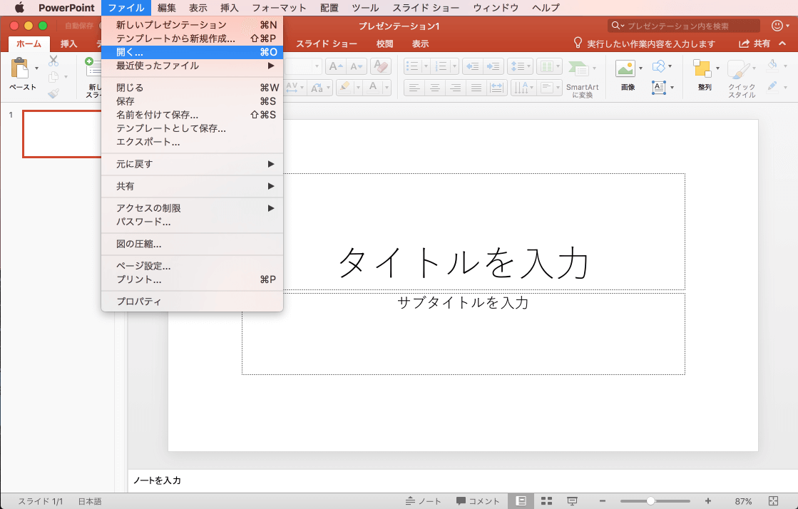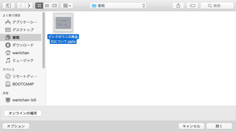 たとえば、[書類]フォルダーのPowerPointプレゼンテーションファイルを開くには、[ファイル]メニューの[開く]をクリック、もしくはクイックアクセスツールバーの[ファイル]をクリックして[開く]を選択して[自分のMac]を選択し、[書類]フォルダー内の開きたいファイルを選択して[開く]ボタンをクリックします。