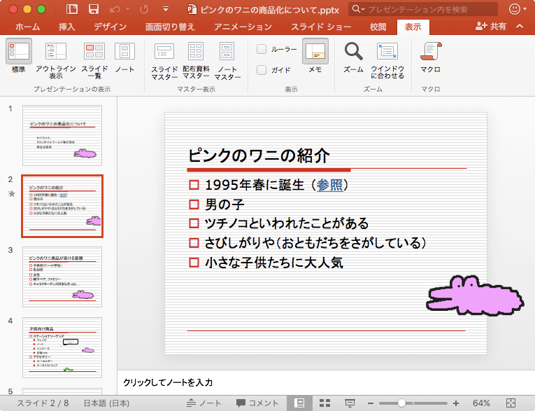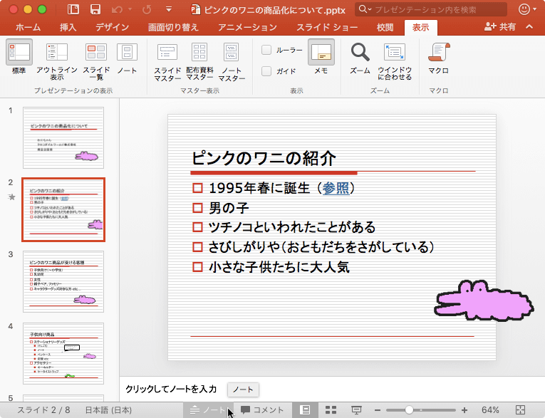 PowerPoint 2016 for Macで発表者のメモをスライドに追加して、プレゼンテーション中にすぐに参照できるようにするには、ノートペインを表示させるとよいでしょう。表示されていない場合は[表示]タブを開き、[表示]グループの[メモ]をクリックするか、ステータスバー右側の[ノート]をクリックします。もう一度クリックすると非表示になります。発表者のメモのウインドウは、プレゼンテーションの標準表示とアウトライン表示では現在のスライドの下に表示され、発表者ツールでは現在のスライドの横に表示されます。