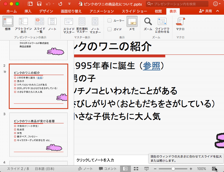 PowerPoint 2016 for Macで現在のウィンドウの大きさに合わせてスライドを拡大または縮小するには、[表示]タブを開き、[ズーム]グループの[ウィンドウサイズに合わせる]をクリックするか、ステータスバー右端のアイコンをクリックします。