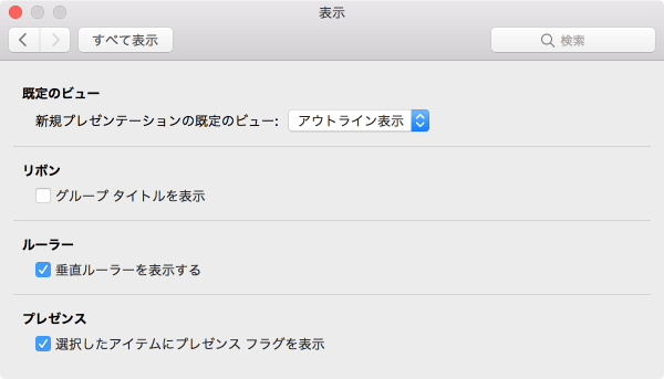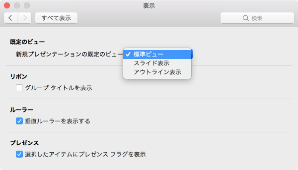 新規プレゼンテーションを作成した場合の既定のビューは「標準ビュー」になっています。これを必要に応じて「スライド一覧」「アウトライン表示」に変更できます。[PowerPoint]メニューの[環境設定]を選択してPowerPoint 環境設定の[表示]を開き、[新規プレゼンテーションの既定のビュー]一覧から選択します。