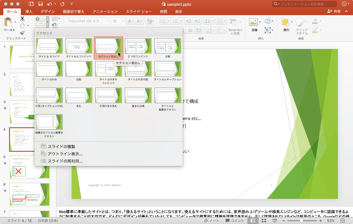 プレゼンテーションの中には、いくつかのセクションに分けることができたりします。PowerPoint 2016 for Macでそのセクションのはじめにセクション見出しを挿入してみましょう。セクション見出しを挿入したい次のスライドを選択し、[ホーム]タブの[スライド]グループの[新しいスライド]の▼をクリックして[セクション見出し]を選択します。