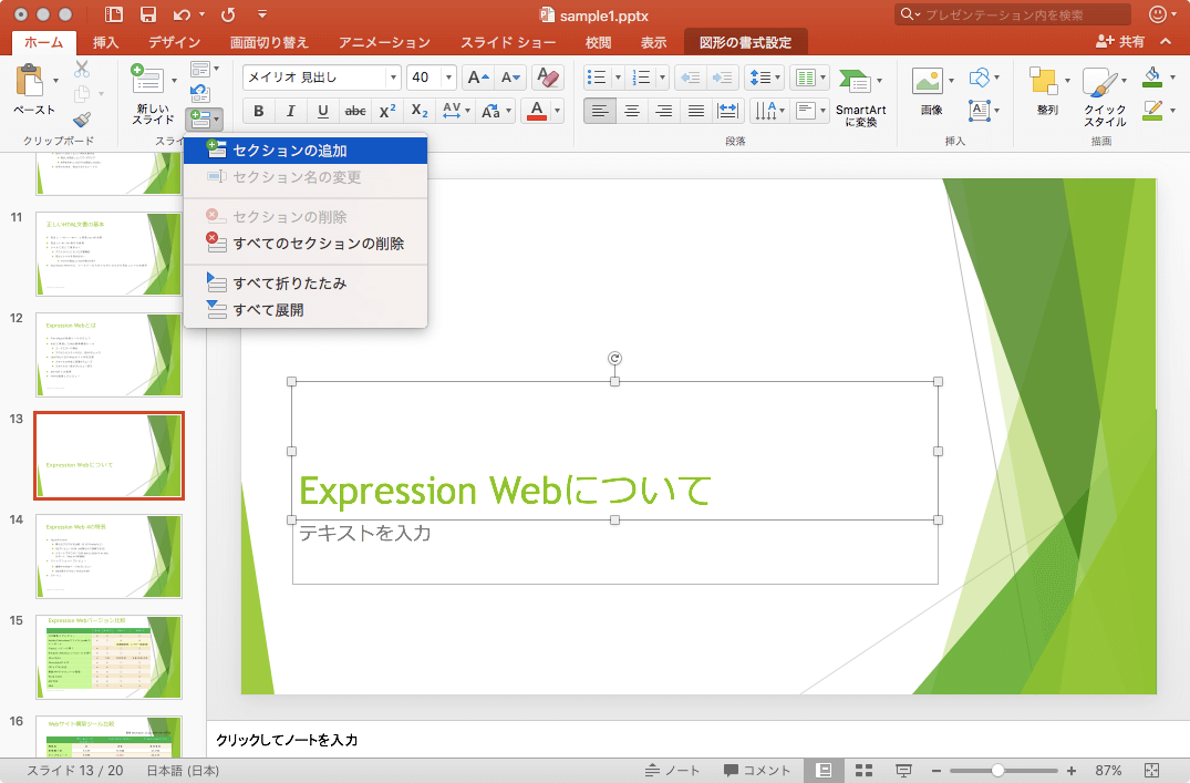 PowerPoint 2016 for Macでスライドをセクションに分けて整理するには、セクション見出しスライドを選択して[ホーム]タブの[セクション]をクリックして[セクションの追加]をクリックします。すると、そのスライド以降すべてがセクションで区切られます。セクションを分割するには、別のセクション見出しスライドを選択してセクションを追加するとOKです。