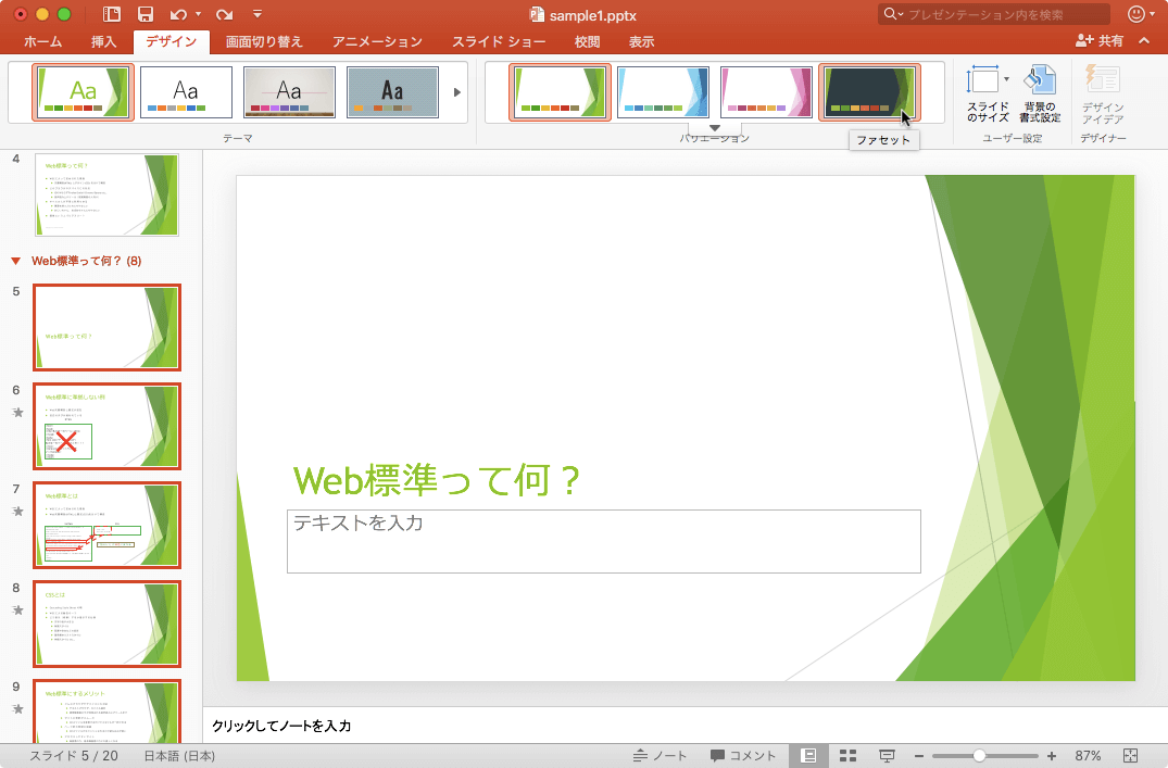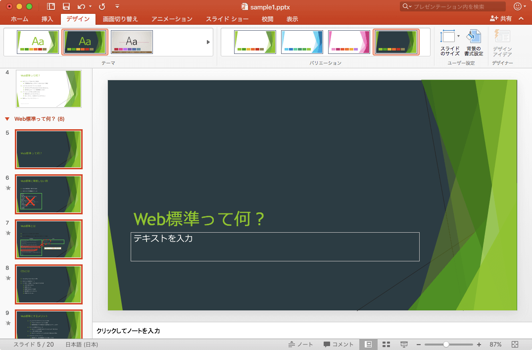 PowerPoint 2016 for Macでセクションごとにテーマやバリエーションを変更することができます。セクションを選択して[デザイン]タブを開き、[テーマ]一覧より適用したいテーマを選択します。新形式のテーマの場合はバリエーションも選択でき、必要に応じて変更することも可能です。