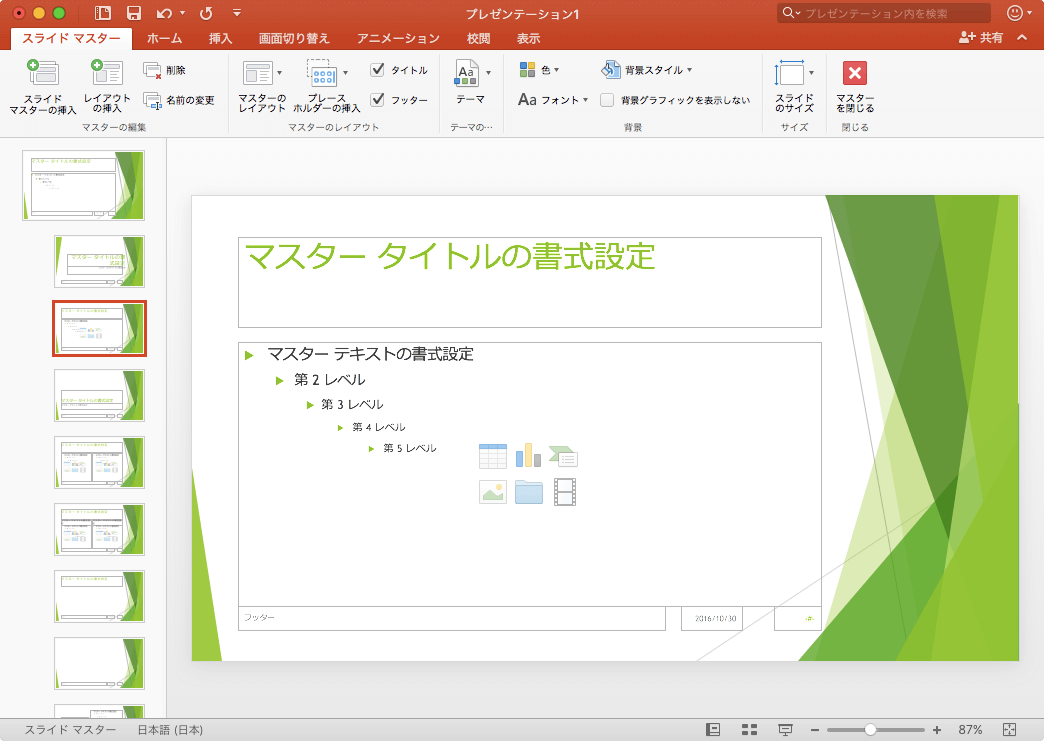 PowerPoint 2016 for Macで現在のプレゼンテーションに不要なスライドマスターのレイアウトを削除するには、該当のスライドレイアウトを選択し、[スライドマスター]タブの[マスターの編集]グループの[削除]を選択します。ただし、使われているタイトルマスターは削除できないので注意してください。