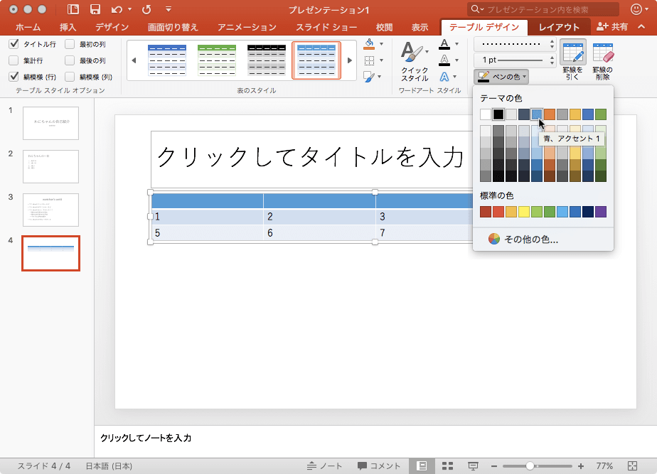 PowerPoint 2016 for Macで一部分の辺の罫線の色やパターンを変更したい場合、マウスで罫線を引くこともできます。表内にカーソルを移動し、[テーブルデザイン]タブをクリックして、[罫線の作成]グループからペンのスタイル、ペンの太さ、ペンの色を指定して[罫線を引く]をクリックするとそのペンの設定で罫線を引くことが可能です。
