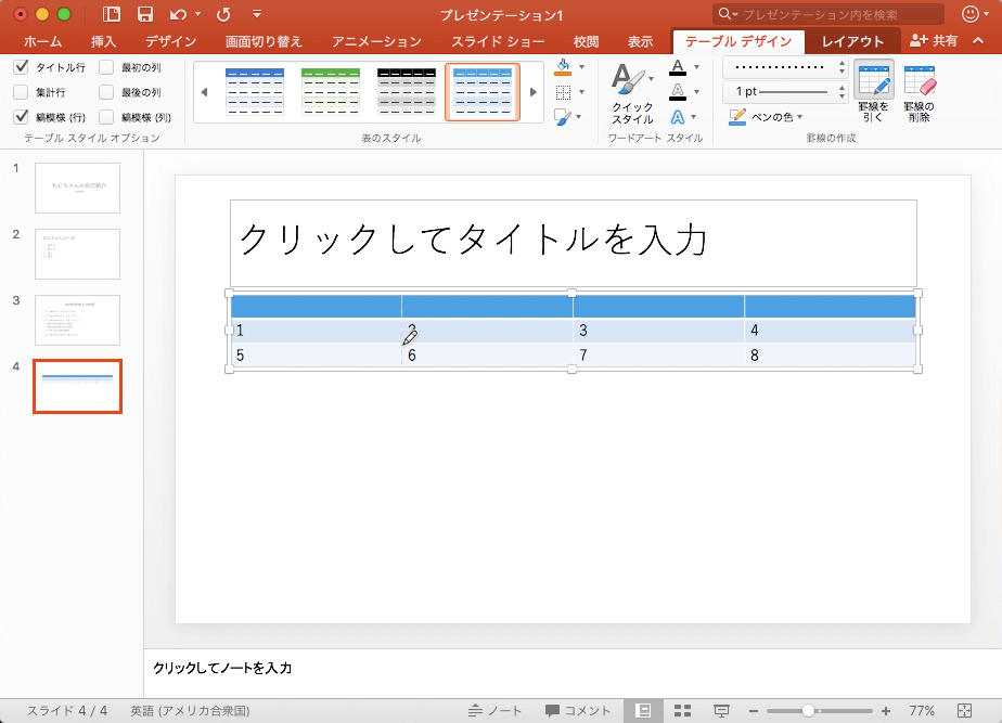 - 表内にカーソルを移動し、[テーブルデザイン]タブをクリックします。