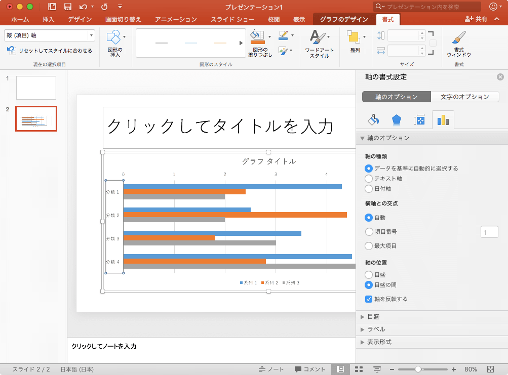 横棒グラフの場合、項目軸が逆になります。この場合、項目軸(分類)を逆にするには、項目軸ラベルを選択して項目軸を逆にする必要があります。PowerPoint 2016 for Macで項目軸を選択して[書式]タブを開き、[書式ウィンドウ]をクリックして、[軸の書式設定]ウィンドウの[軸のオプション]の[軸を反転する]にチェックを付けます。