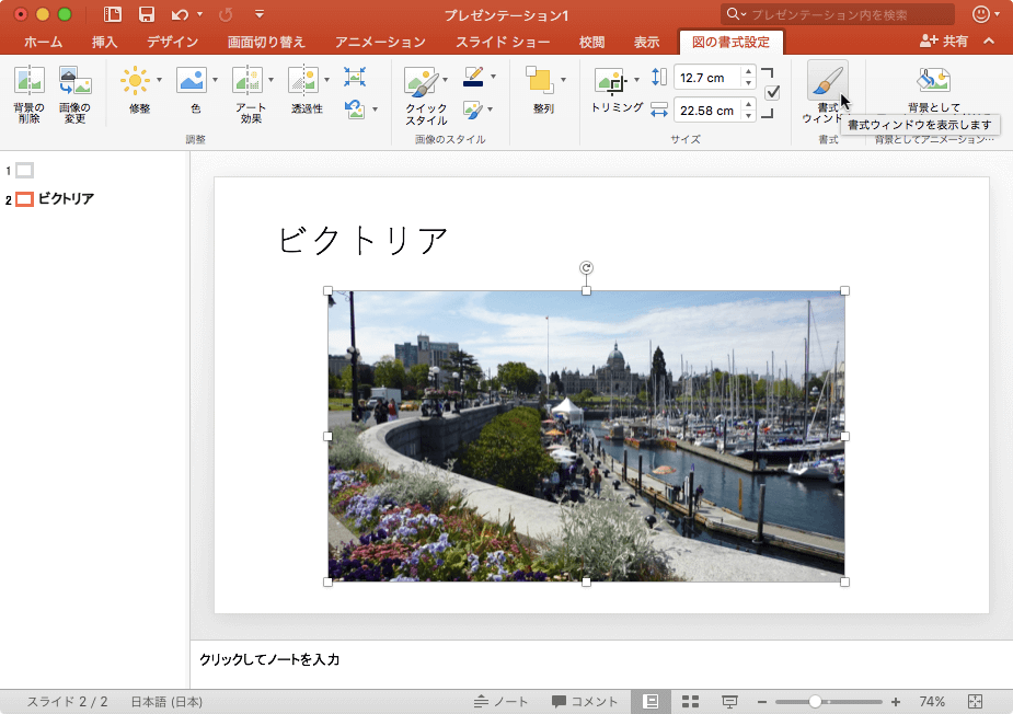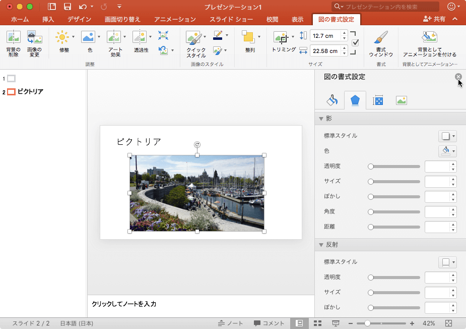 Office 2016 for Macでは、図の書式設定作業ウィンドウを使用して図のスタイルを細かく設定できます。対象となる図を選択して[図の書式設定]タブを開き、[画像のスタイル]グループ右下の[図の書式設定]をクリックすると表示されます。なお、[図の書式設定]作業ウィンドウを閉じるには、その右上の閉じるをクリックするとOKです。
