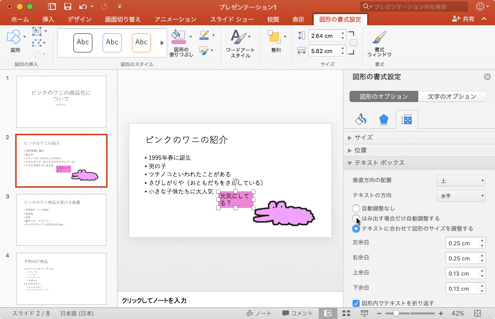 PowerPoint 2016 for Macで図形からテキストがはみ出す場合のみ、図形のサイズを基準にして自動的にフォントのサイズを変えるには、テキストボックスを選択して[図形の書式設定]作業ウィンドウの[図形のオプション]の[サイズとプロパティ]を開き、[テキストボックス]のオプションの[はみ出す場合だけ自動調整する]を選択します。