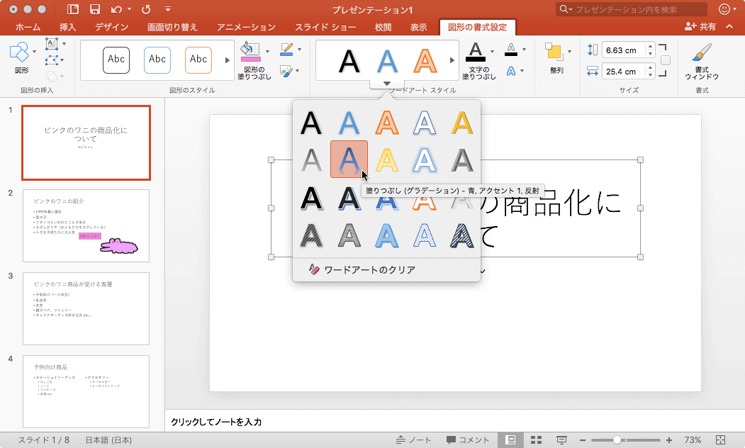 PowerPoint 2016 for Macであらかじめ用意されているテキストスタイルを選んで、装飾的な効果を加えるには、対象となるテキストボックスまたはプレースホルダーを選択して、[図形の書式設定]タブを開き、ワードアートのスタイル一覧から選択します。