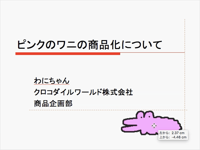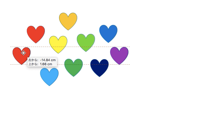 - そのままドラッグすると、他のオブジェクトの左端、中央、右端のラインに達するとガイドが表示されます。その位置でドロップします。