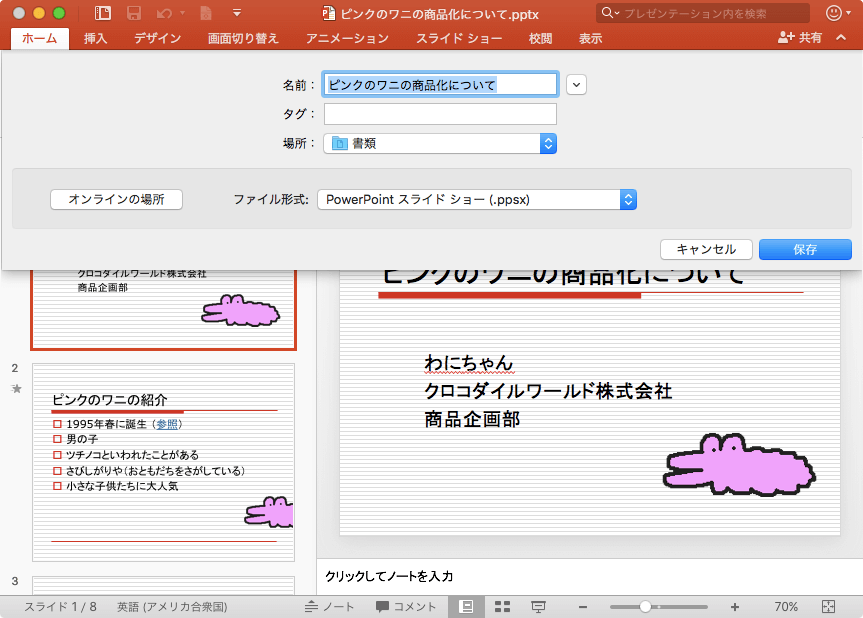 通常、ファイルをダブルクリックすると、PowerPoint 2016 for Macが起動してそのファイルが開くようになりますが、スライドショーとして保存することによって、ダブルクリックすることでスライドショーが実行されるようになります。 [ファイル]メニューの[名前を付けて保存]を選択して、[ファイル形式]一覧から[PowerPointスライドショー (.odp)]を選択します。