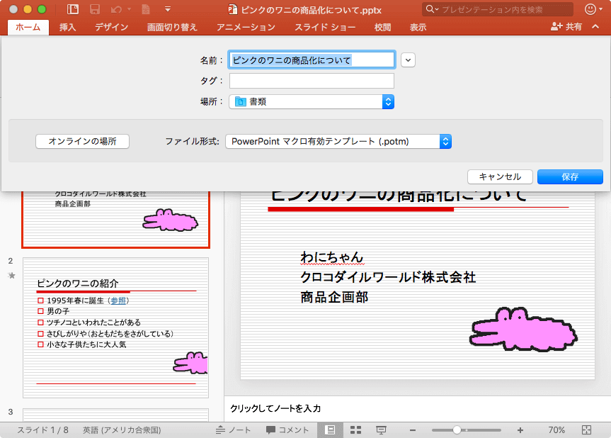 PowerPoint マクロ有効テンプレート形式で保存するには