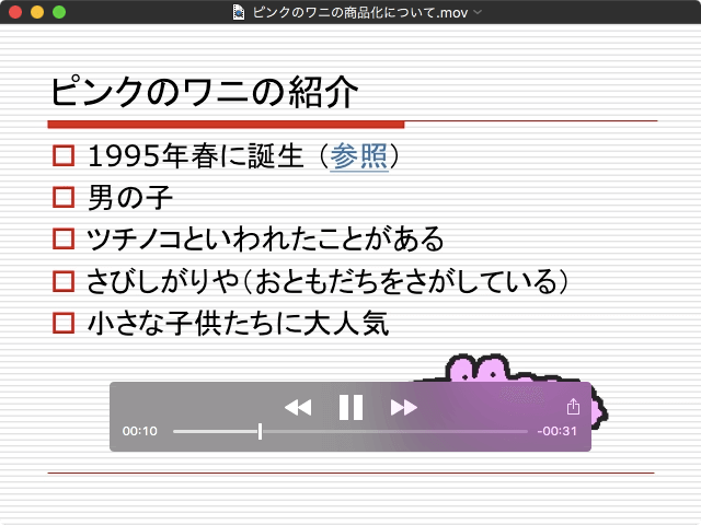 PowerPointプレゼンテーションから完全な再現性が維持されたビデオを作成し、CDやWeb、または電子メールを使用して配布できます。MOVファイルは一部のデジタルビデオカメラがこの形式でデータを記録します。インターネット上での動画配信によく使われている形式の一つです。