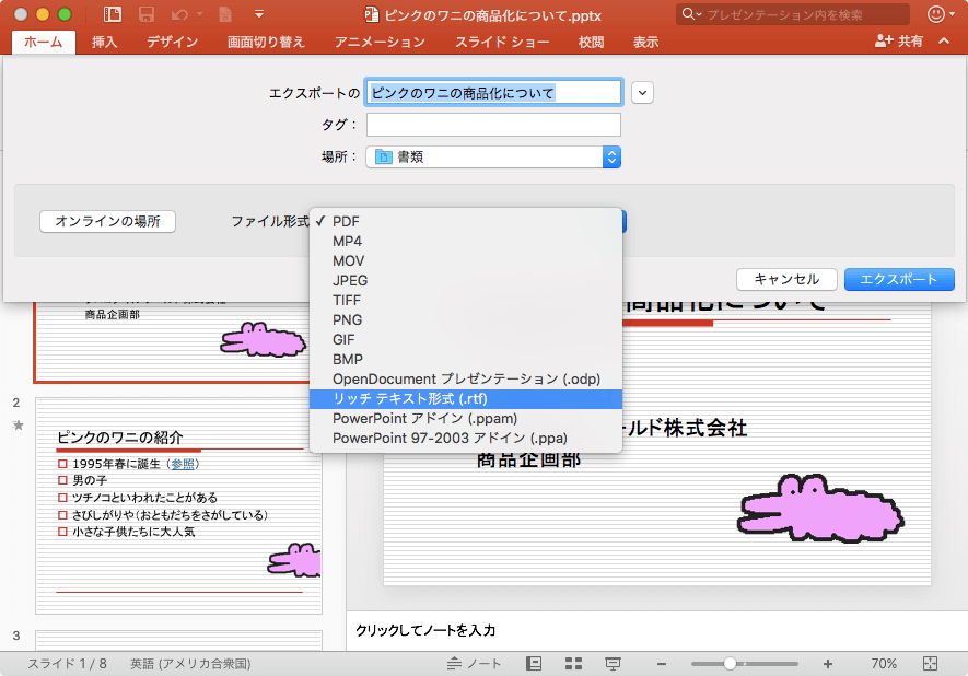 アウトライン/リッチテキスト形式(.rtf)は、文字の大きさが維持されたテキスト形式で、WordがインストールされていないMacでも標準のテキストエディットで開くことができます。PowerPoint 2016 for Macでは[ファイル]メニューの[エクスポート]をクリックして、[ファイル形式]ボックスから[リッチテキスト形式 (.rtf)]を選択します。