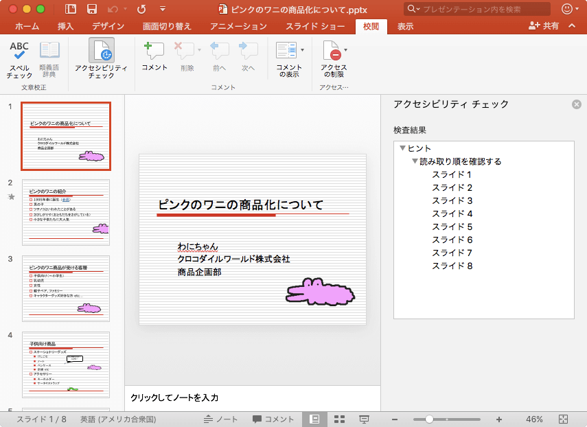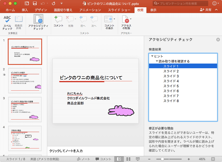 障碍のあるユーザーがドキュメントのコンテンツを問題なく読み取るようにするためには、アクセシビリティに関する問題を解決する必要があります。PowerPoint 2016 for Macからは[ツール]メニューの[アクセシビリティチェック]、もしくは[校閲]タブを開き、[アクセシビリティチェック]をクリックします。