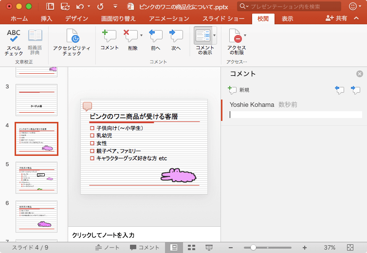 PowerPoint 2016 for Macでコメントを挿入したいスライドを選択して[校閲]タブの[コメント]をクリックするか、[コメント]作業ウィンドウの[新規]をクリックすると、コメントボックスが表示されるので、そこで文字を入力するとOKです。