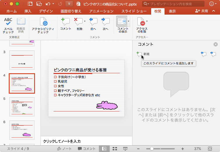 - コメントを挿入したいスライドを選択して[校閲]タブの[コメント]をクリックします。