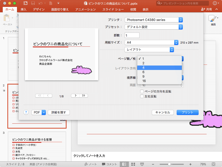 [ページ数/枚]オプションより1枚に割り当てるスライド数を指定します。