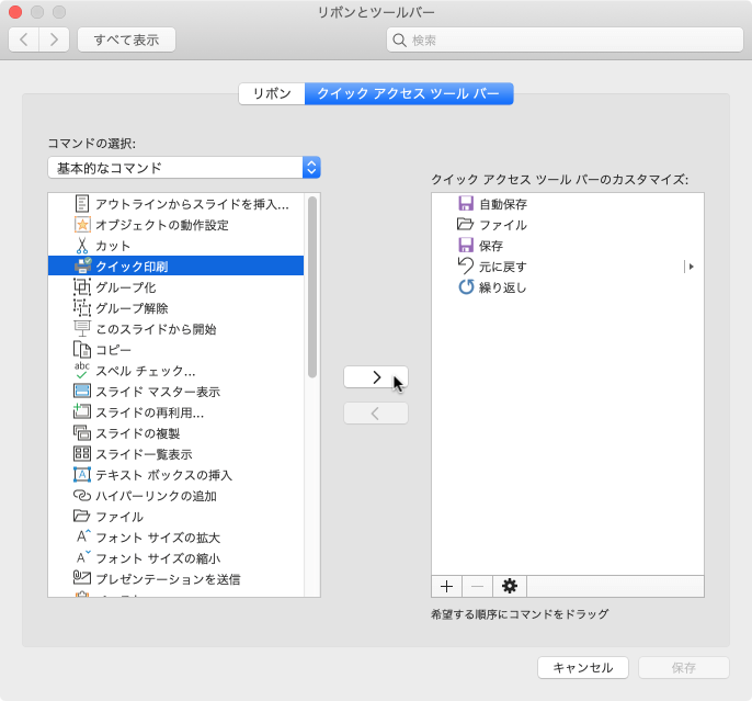 [リボンとツールバー]ダイアログボックスの[クイックアクセスツールバー]が開かれたら、[クイック印刷]を選択して[>]ボタンをクリックします。