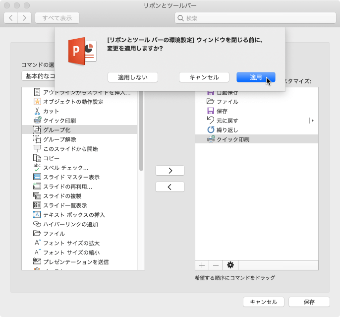 - 追加できたことを確認して左上の赤い閉じるボタンをクリックすると、「[リボンとツールバーの環境設定]