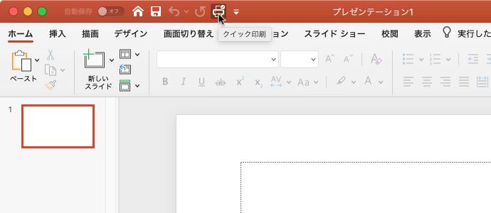 PowerPoint for Microsoft 365 for Macのクイックアクセスツールバーの▼をクリックし、[その他のコマンド]から追加したいコマンドを選択します。[リボンとツールバー]ダイアログボックスを開いて[クイックアクセスツールバー]から行えます。[リボンにないコマンド]カテゴリには、さまざまな便利なコマンドが用意されています。ここでは「クイック印刷」コマンドを追加する方法について説明します。