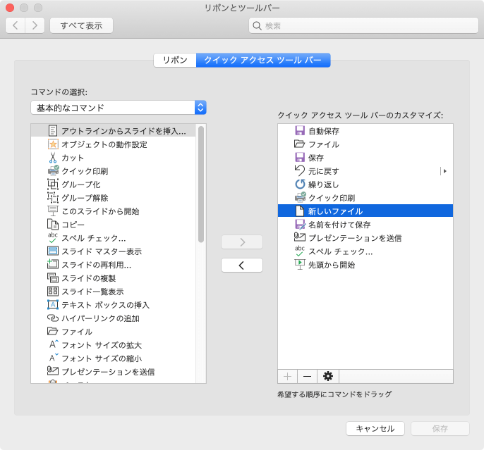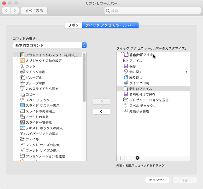 PowerPoint for Microsoft 365 for Macでは[リボンとツールバーの環境設定]ウィンドウの[クイックアクセスツールバー]タブを開き、順序を変更したいコマンドを選択して移動先までドラッグしていきます。[保存]ボタンをクリックしてはじめて変更が反映されます。
