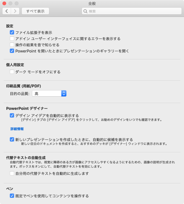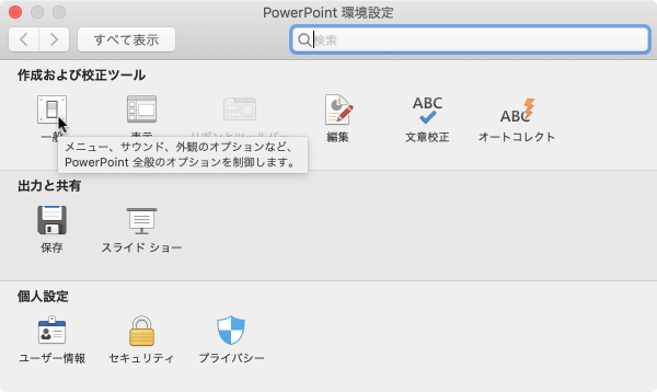 PowerPoint for Microsoft 365 for Macでは[PowerPoint]メニューの[環境設定]からPowerPoint 環境設定の[全般]を開き、[ファイル拡張子を表示]のチェックを付けるとファイル拡張子が表示されるようになります。