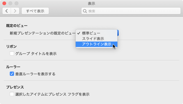新規プレゼンテーションの既定のビューをアウトライン表示に変更する