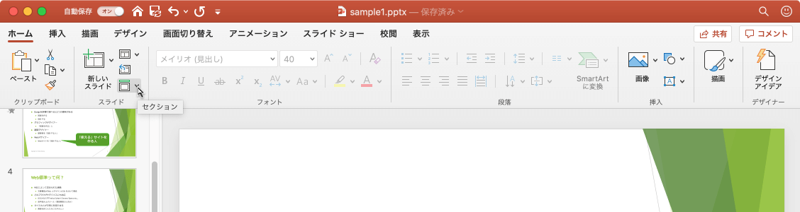 - [ホーム]タブの[スライド]グループの[セクション]をクリックします。