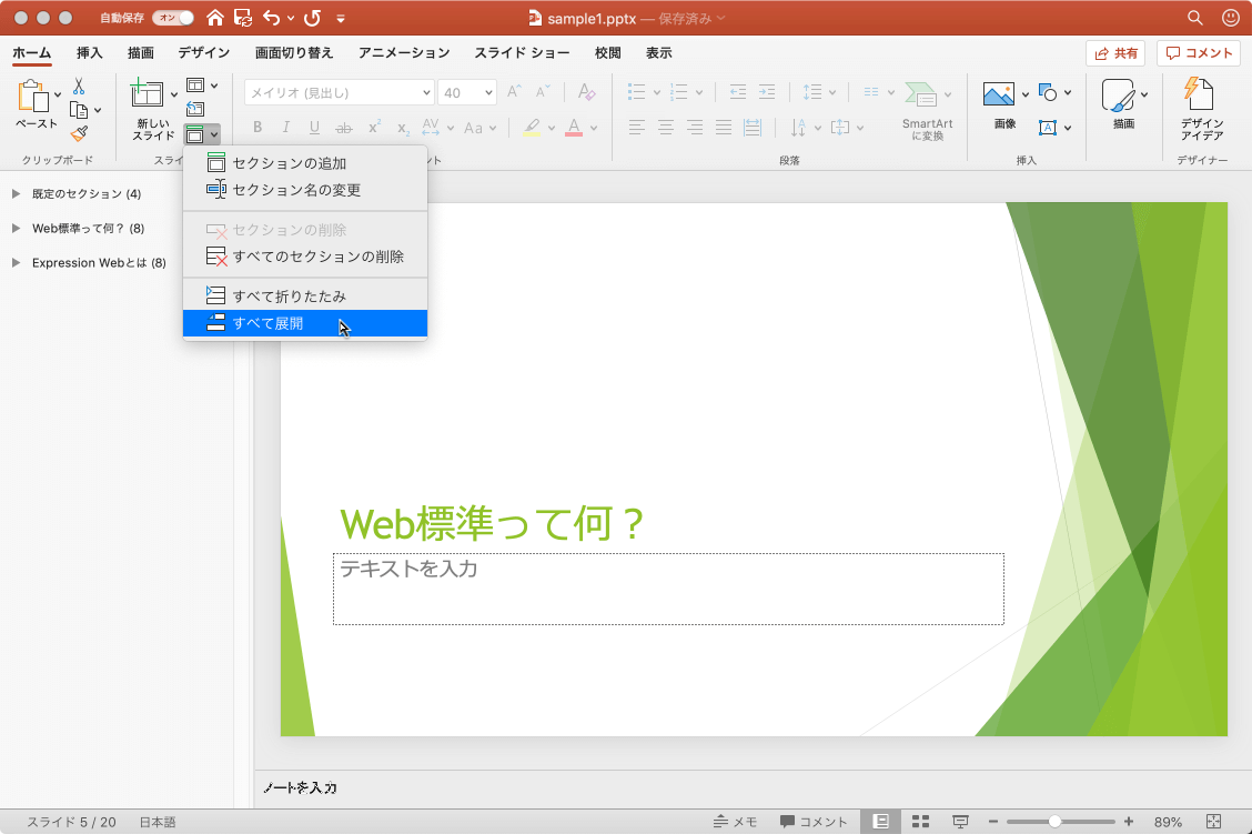 なお、スライド一覧ペインのセクション名を右クリックして[すべて折りたたみ]や[すべて展開]も行えます。