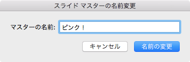- [スライド マスターの名前変更]の[マスターの名前]に名前を入力して[名前の変更]ボタンをクリックします。