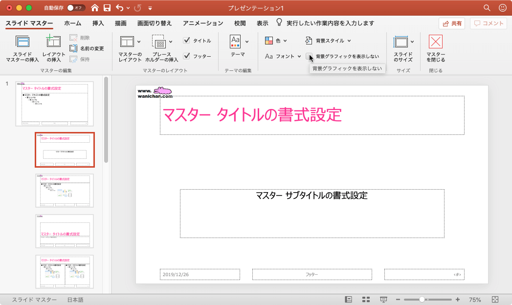 - [スライド マスター]タブの[背景]グループ、[背景グラフィックを表示しない]にチェックを入れます。