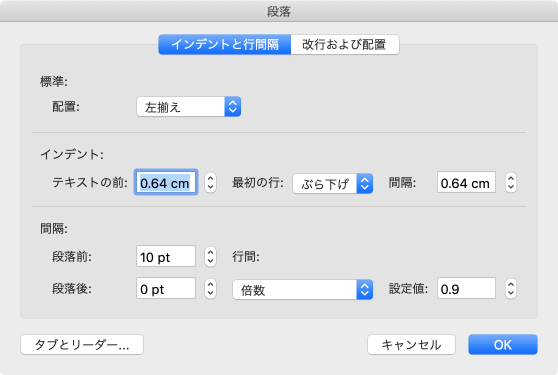 インデントはcm単位で調整され、整数や 0.64 cm のような小数を指定できます。 - [間隔]