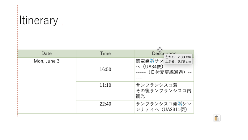 Web上の記事内の表をスライドにインポートするには、コピー&ペーストで簡単に行えます。SafariでWeb上の表を選択してクリップボードにコピーし、コンテンツプレースホルダーを選択して貼り付けると、その表は貼り付け先の書式に合わせてセンタリングで貼り付けられます。その後、表の配置やサイズを調整します。